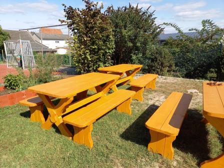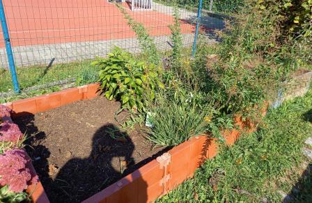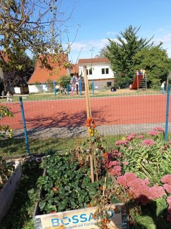 Grünes Klassenzimmer. Im Frühjahr 2022 werden die Sitzplätze mit einem Sonnenschutz überdacht (Pergola). Außerdem wird hier noch ein Insektenhotel aufgebaut.